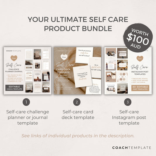 Editable Self Care Challenge Planner Journal Canva Template - 32CTSC